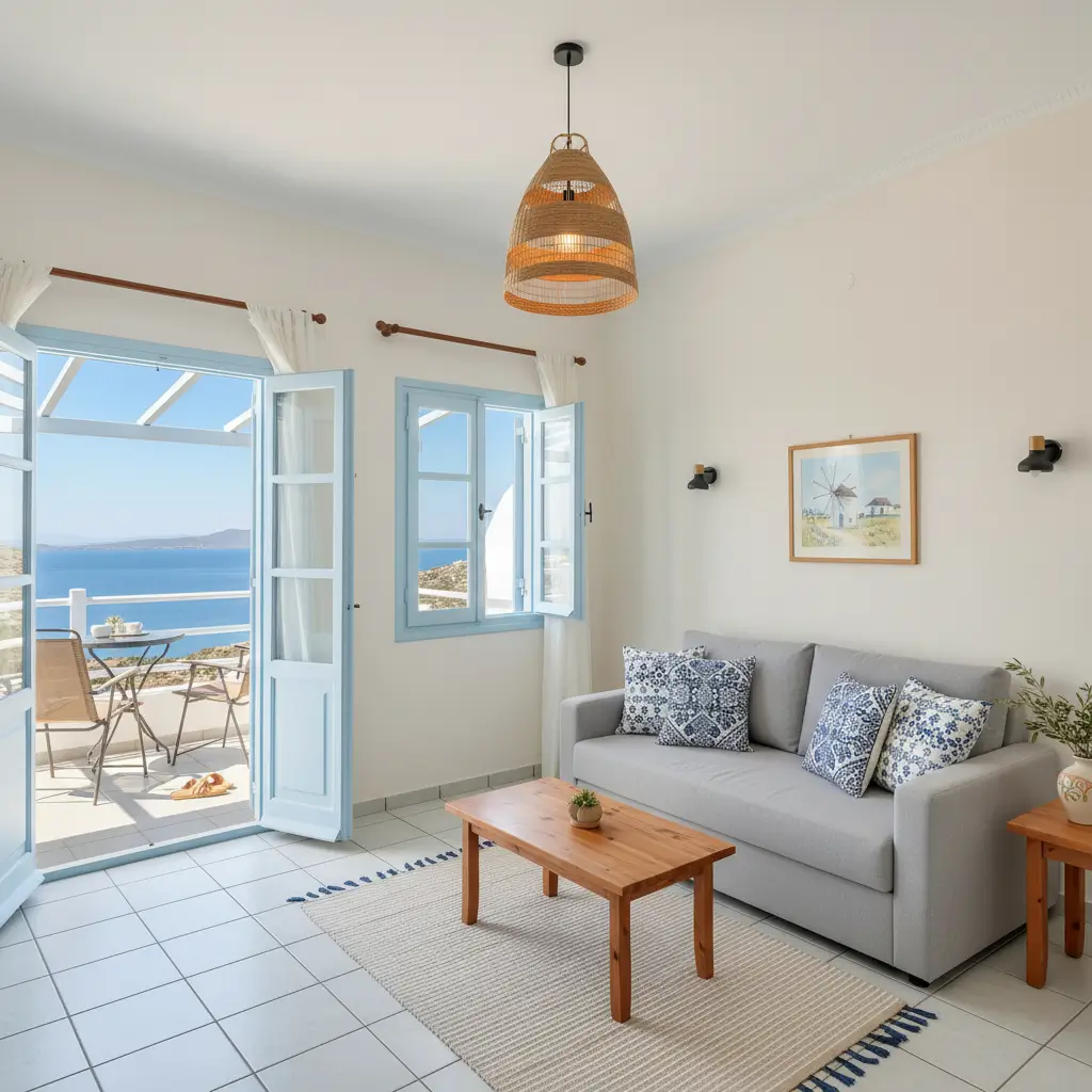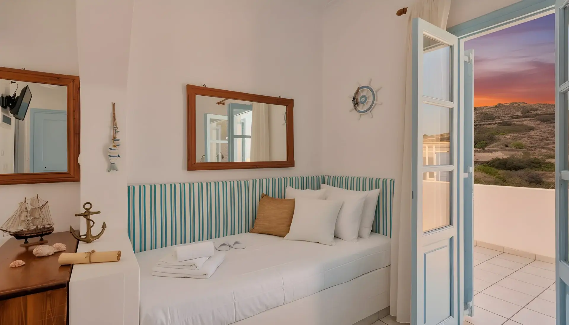 The Triple Room with Sea View is ideal for three people and features 1 double bed and 1 single bed or 3 Single beds. Has a bathroom and a terrace with an endless view to the Aegean Sea.